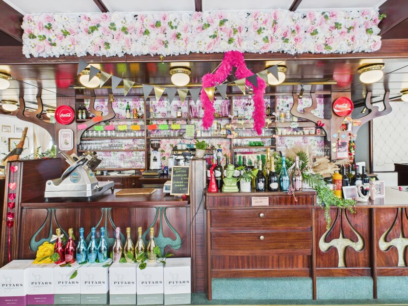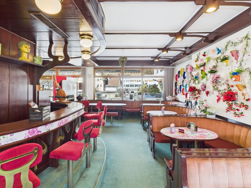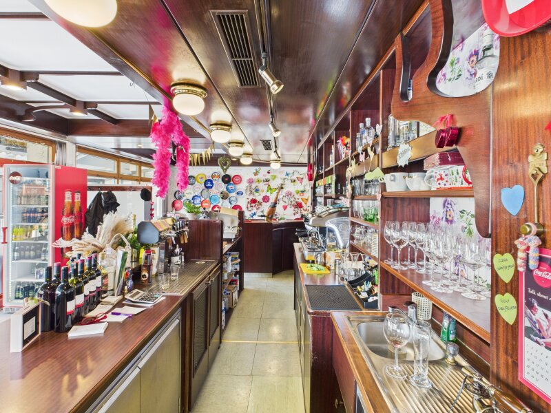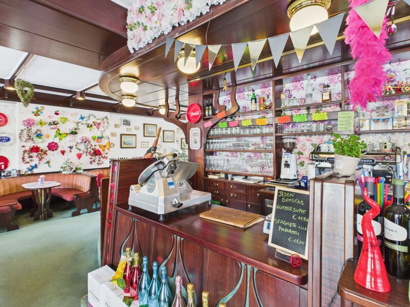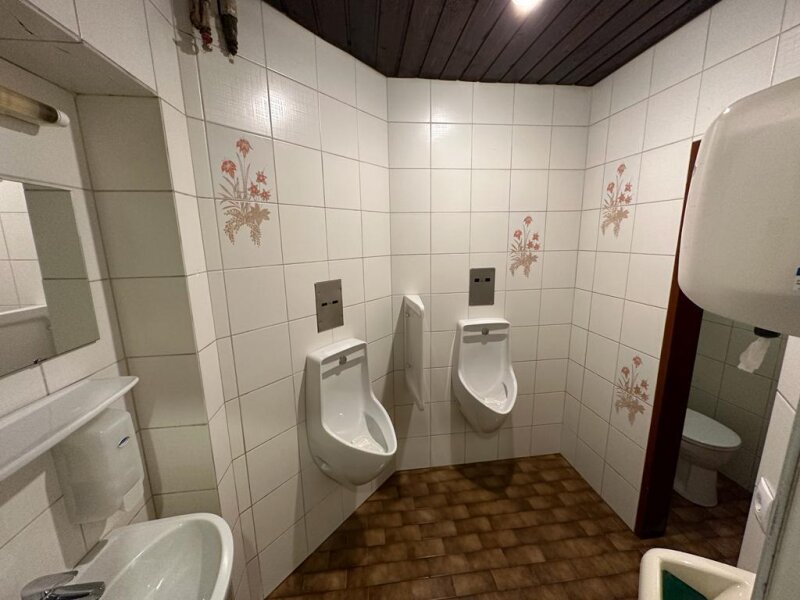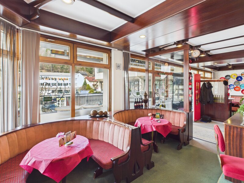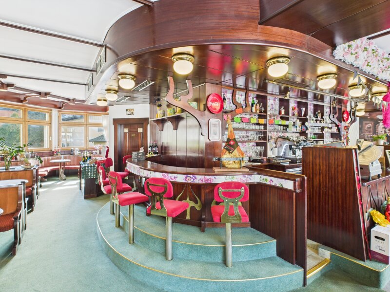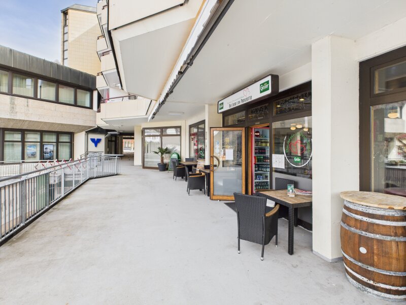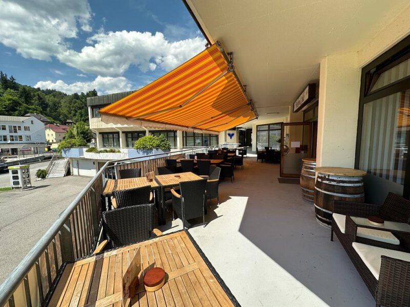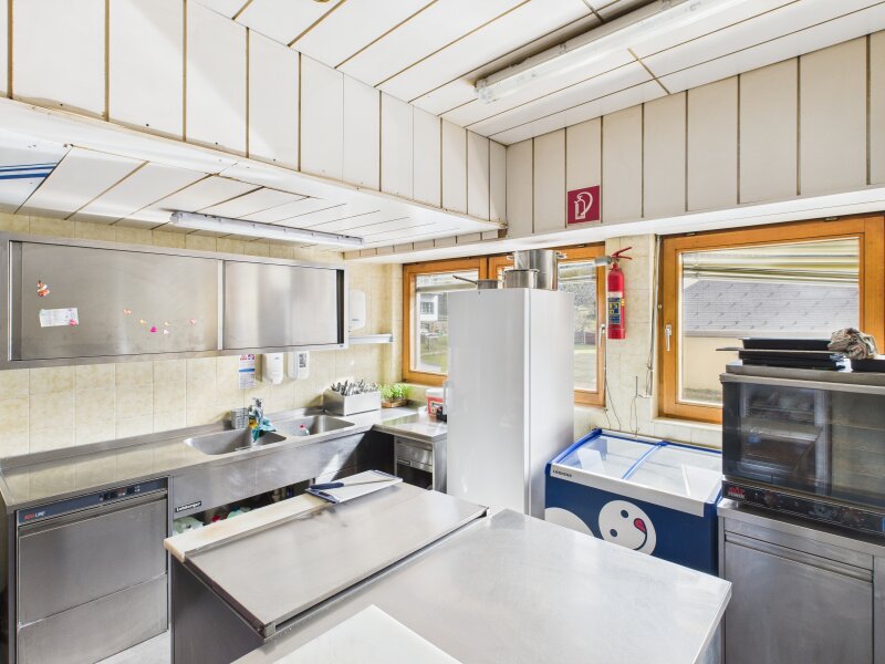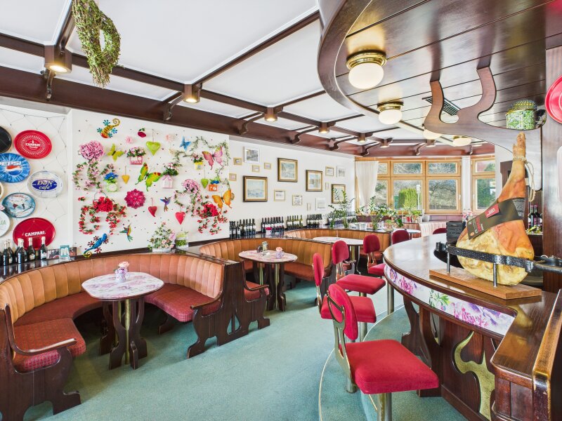 On the west side in the entrance area, there is a large terrace area that has been used gastronomically for decades. Seats for 80 people inside (12 tables), 32 people in the outdoor area (7 tables) are available.
