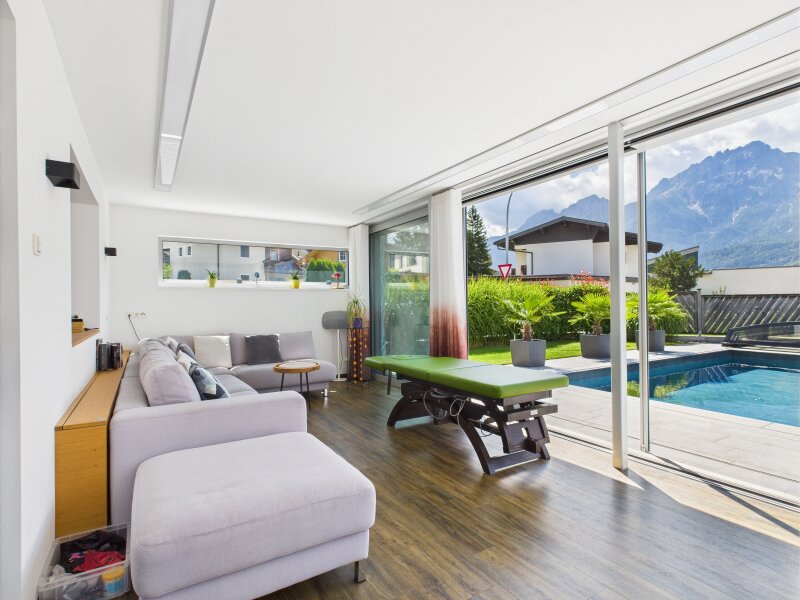 Upon entering the house, you can feel: Here, attention to detail has been planned and implemented to a high standard. The light-flooded living and dining area with winter garden (approx. 48 m²) offers a wonderful view of the greenery and direct access to the sunny terrace and the covered swimming pool (7 m x 3.5 m) – perfect for relaxing summer days.