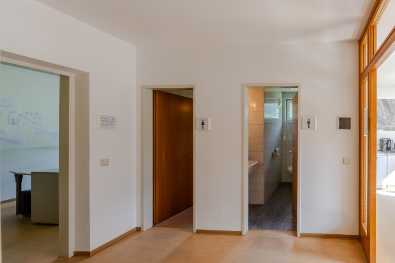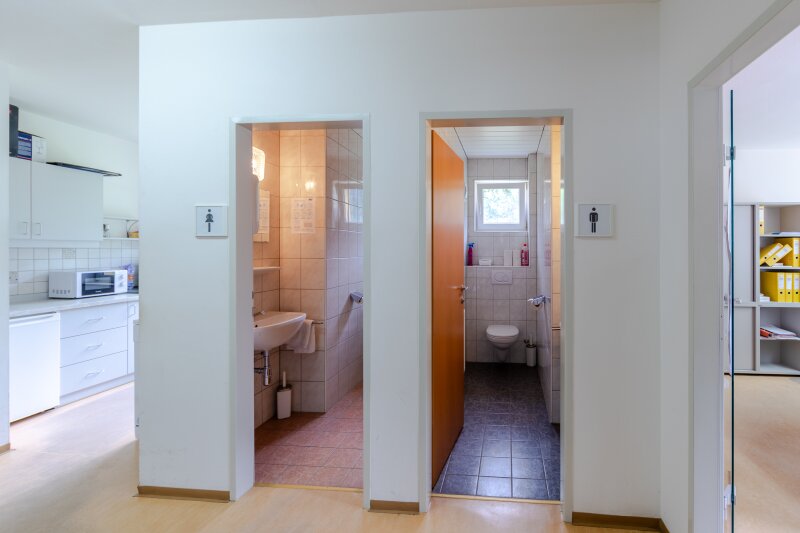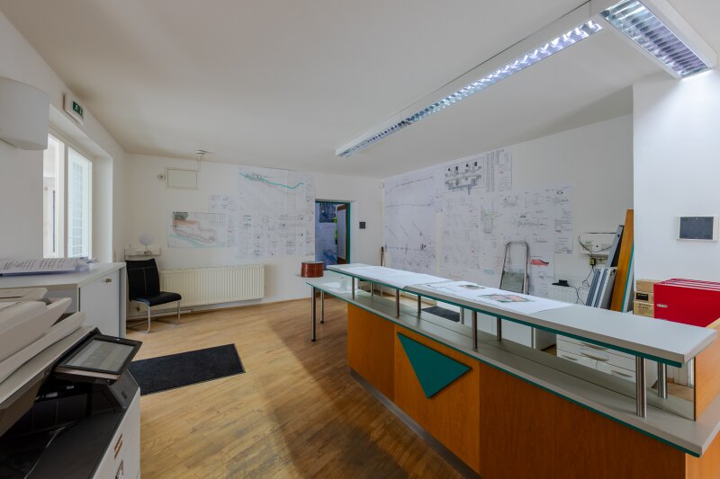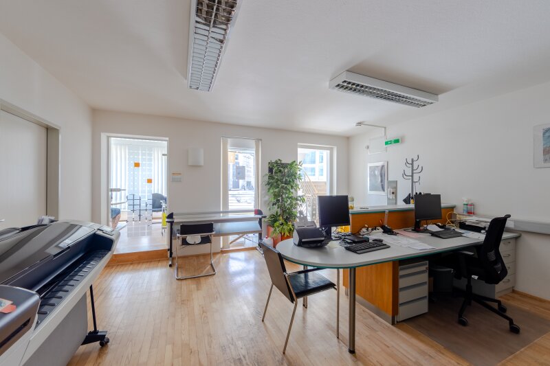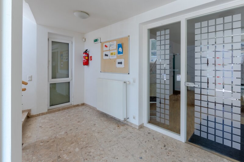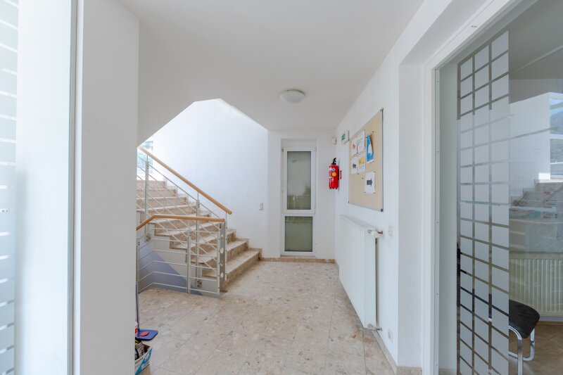 Die vermietbaren Büroflächen gehören zum EG und 1. Stock. Im Eingangsbereich des Erdgeschosses befindet sich ein zentraler Empfang. Jede Etage wird durch eine separate Teeküche und WC ergänzt.