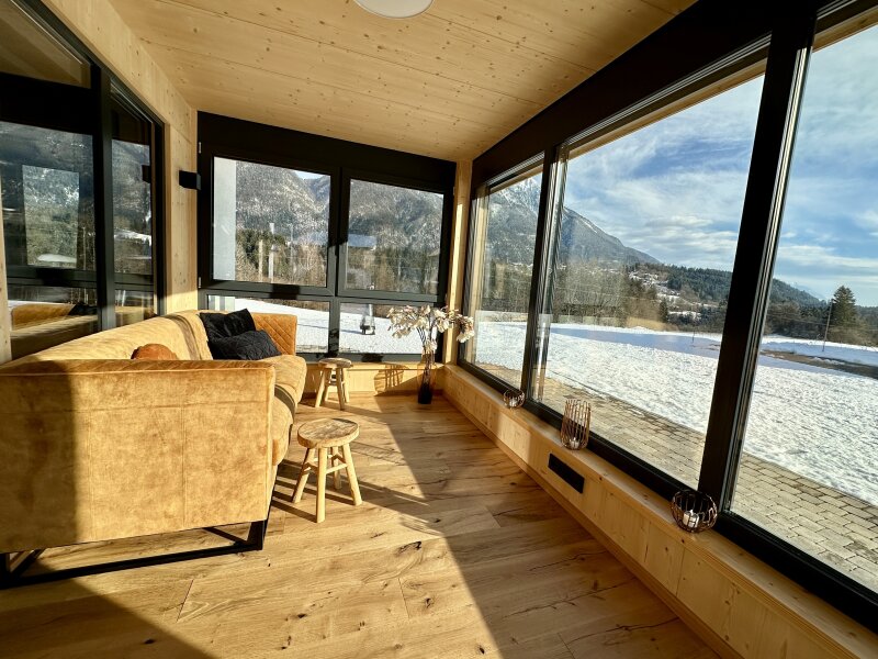 Atemberaubender Wintergarten: Betreten Sie den Wintergarten und lassen Sie sich vom Panoramablick auf die Berge verzaubern, ideal für gemütliche Winterabende oder zum Genießen der sonnenverwöhnten österreichischen Landschaft.