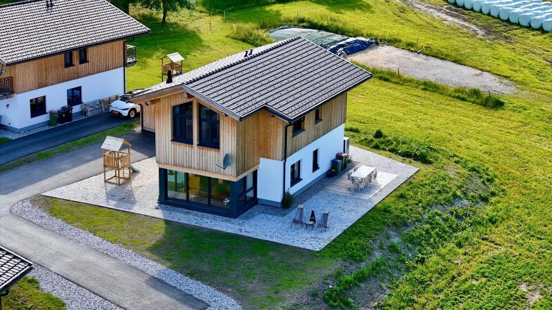 Dielen, Fliesen, Parkett, Zentralheizung, Wohnküche / offene Küche, Bad mit Fenster, Dusche, Kabel / Satelliten-TV, Garage, Parkplatz, Luftwärmepumpe, Wintergarten, Fahrradraum, Abstellraum, Räume veränderbar, Gartennutzung, Außenliegender Sonnenschutz, Öffenbare Fenster, Stehleuchten, Deckenleuchten, Toilette, Gäste-WC, Satteldach, Fertigteil, Holz, Schlüsselfertig mit Bodenplatte, Bergblick, Fernblick, Kinderspielplatz, Schallschutzfenster, Grünblick