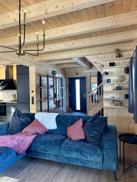 Der große, offene Wohnbereich ist perfekt zum Entspannen mit der Familie oder zum Bewirten von Gästen, er ist mit natürlichem Licht durchflutet und geht nahtlos in die wunderschöne Landschaft draußen über.